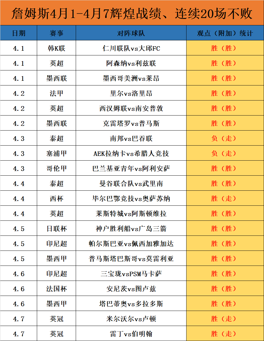 一、历史辉煌成绩,4月1日-4月7日连续20场打出了不败的成绩。
