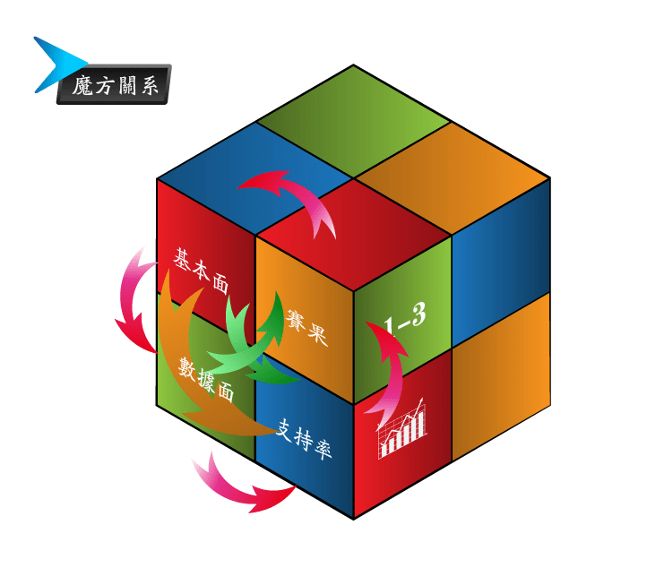 利用本人專業知識領域探究出基本面、數據面、支持率、賽果四者之間存在的內部聯系,成為「魔方關系」
