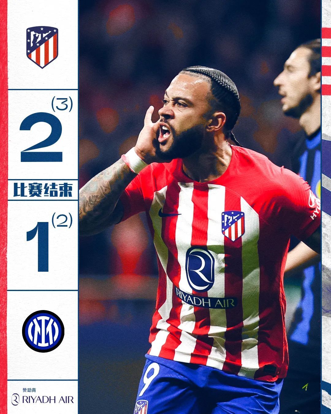 点球大战中,国际米兰恰尔汗奥卢率先罚进,我们则由孟菲斯罚进回击,随后桑切斯和克拉森被奥布拉克连续扑出点球,萨乌尔罚丢,里克尔梅罚进,第四轮阿切尔比和科雷亚也都罚进。关键的第五轮,劳塔罗打飞点球,马竞点球大战3比2获胜,总比分5比4击败国际米兰晋级八强!