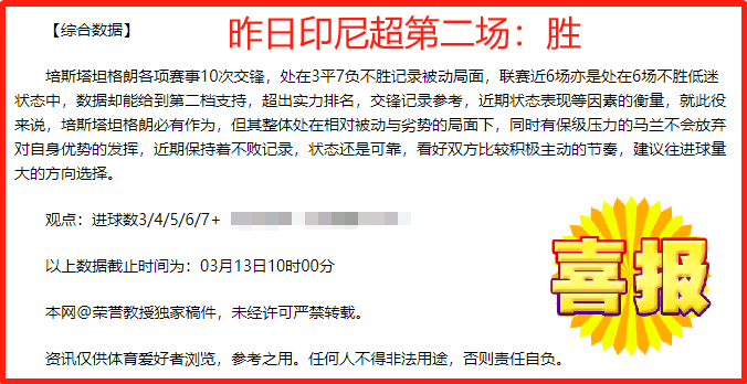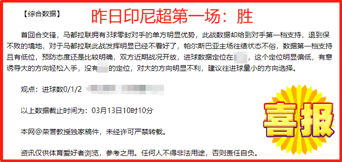 (温馨提示:观点回顾为已完场赛事的统计,并不能代表未来的观点预测结果走势,观点仅为其个人意见,与平.台无关。资讯仅供体育爱好者浏览,并不构成购.彩建议,任何人不得用于非法用途,请广大用户理性消费。)