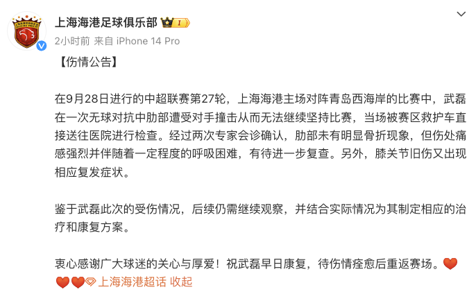 就在今天上午,上海海港官方刚刚发布了武磊的伤情公告。好消息是,肋部没有明显骨折现象。坏消息是,武磊的伤处痛感强烈且有一定程度的呼吸困难,另外膝关节旧伤出现复发症状。